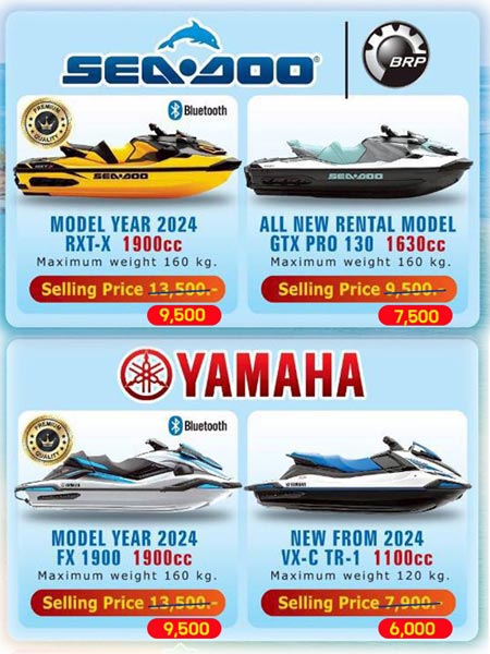 - 1 ลำ เดินทางได้ 2 ท่าน , น้ำหนักตัวรวมกัน ไม่เกิน 160 กก (Seadoo 1900cc , Seadoo 1630cc , yamaha 1900cc)